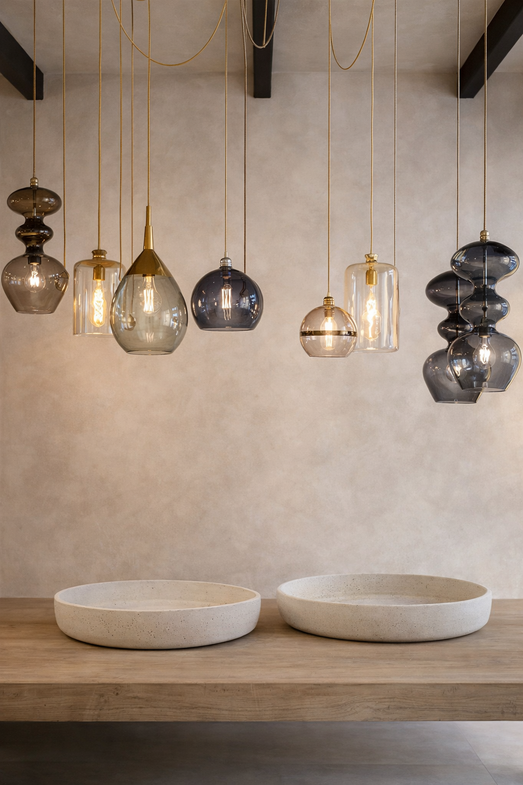 Las zonas de aseo se han tratado como una parte importante del diseño global, con encimeras, lavabos, espejos, iluminación suspendida y materiales coherentes con el resto del proyecto.