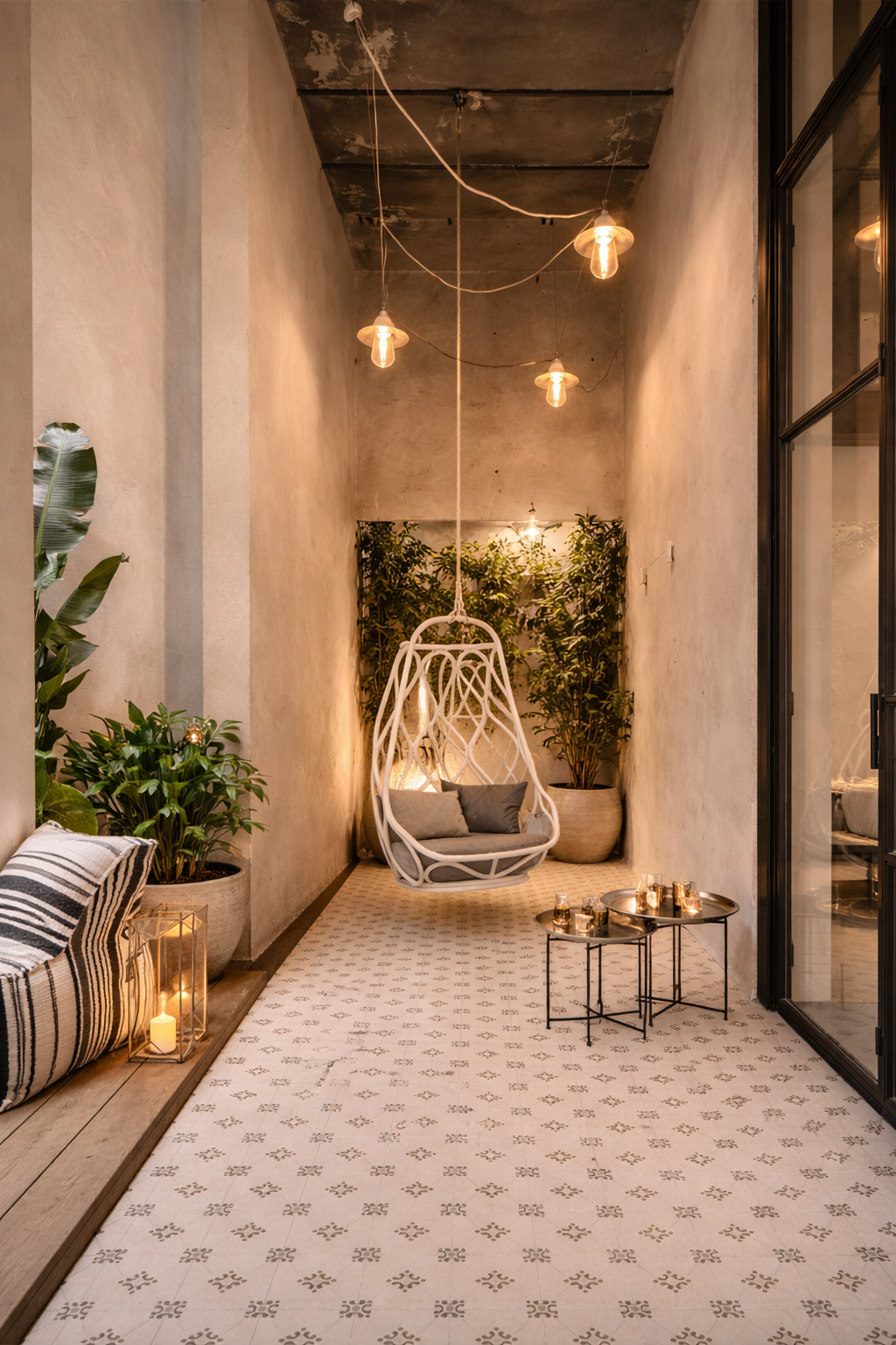 Los patios y espacios intermedios aportan profundidad, luz y sensación de pausa. La integración de vegetación, revestimientos decorativos, iluminación indirecta y mobiliario de apoyo refuerza el carácter experiencial del conjunto.
