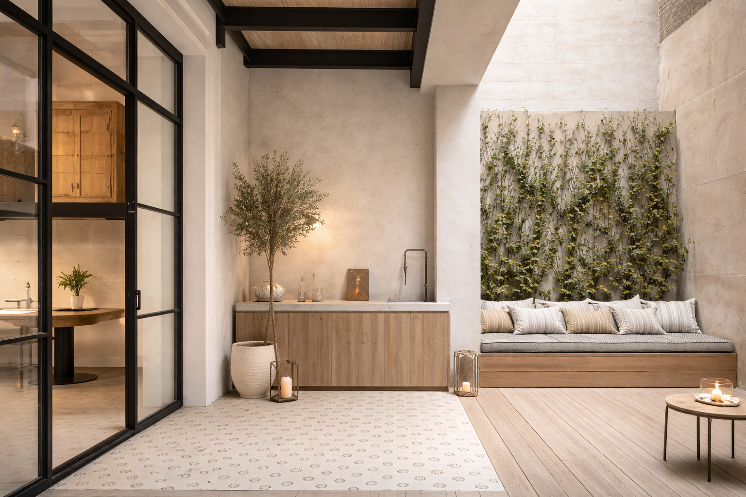 Predominan la madera natural, el hierro negro, el vidrio, la piedra, el ladrillo restaurado, los revestimientos minerales y la cerámica, junto con una paleta de tonos neutros y cálidos.