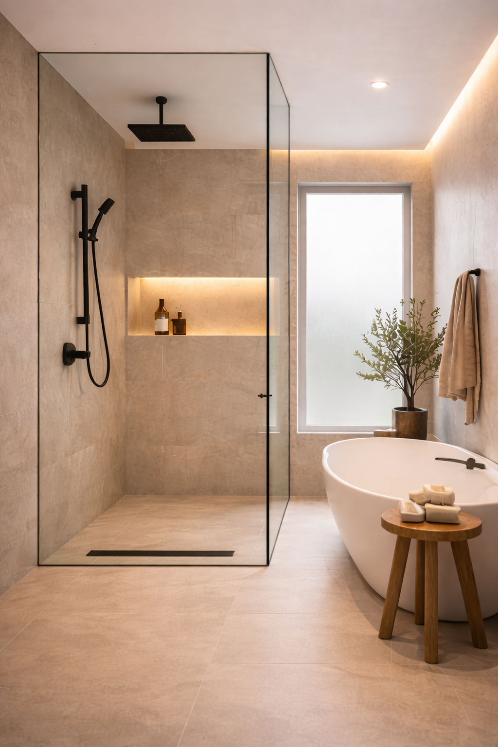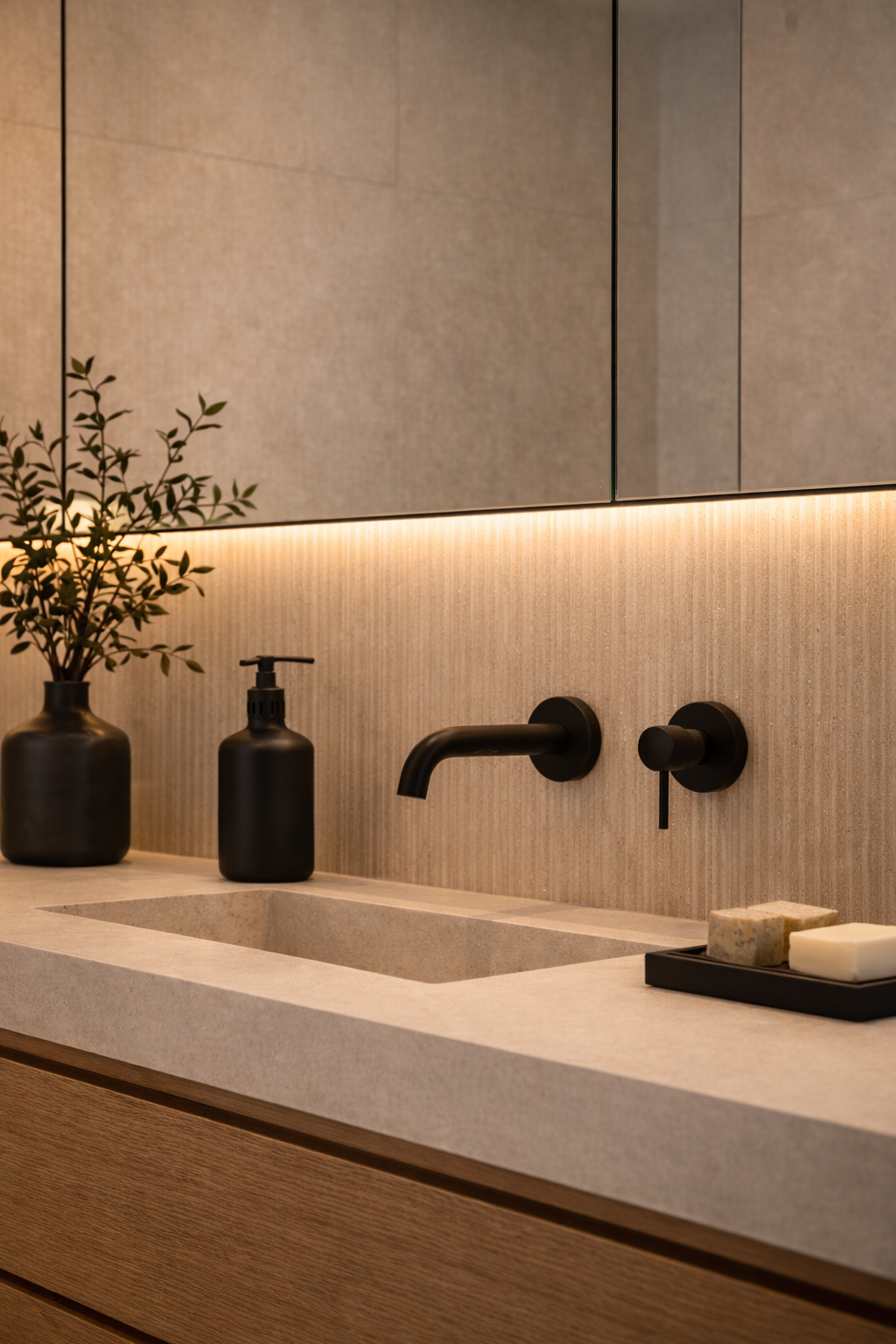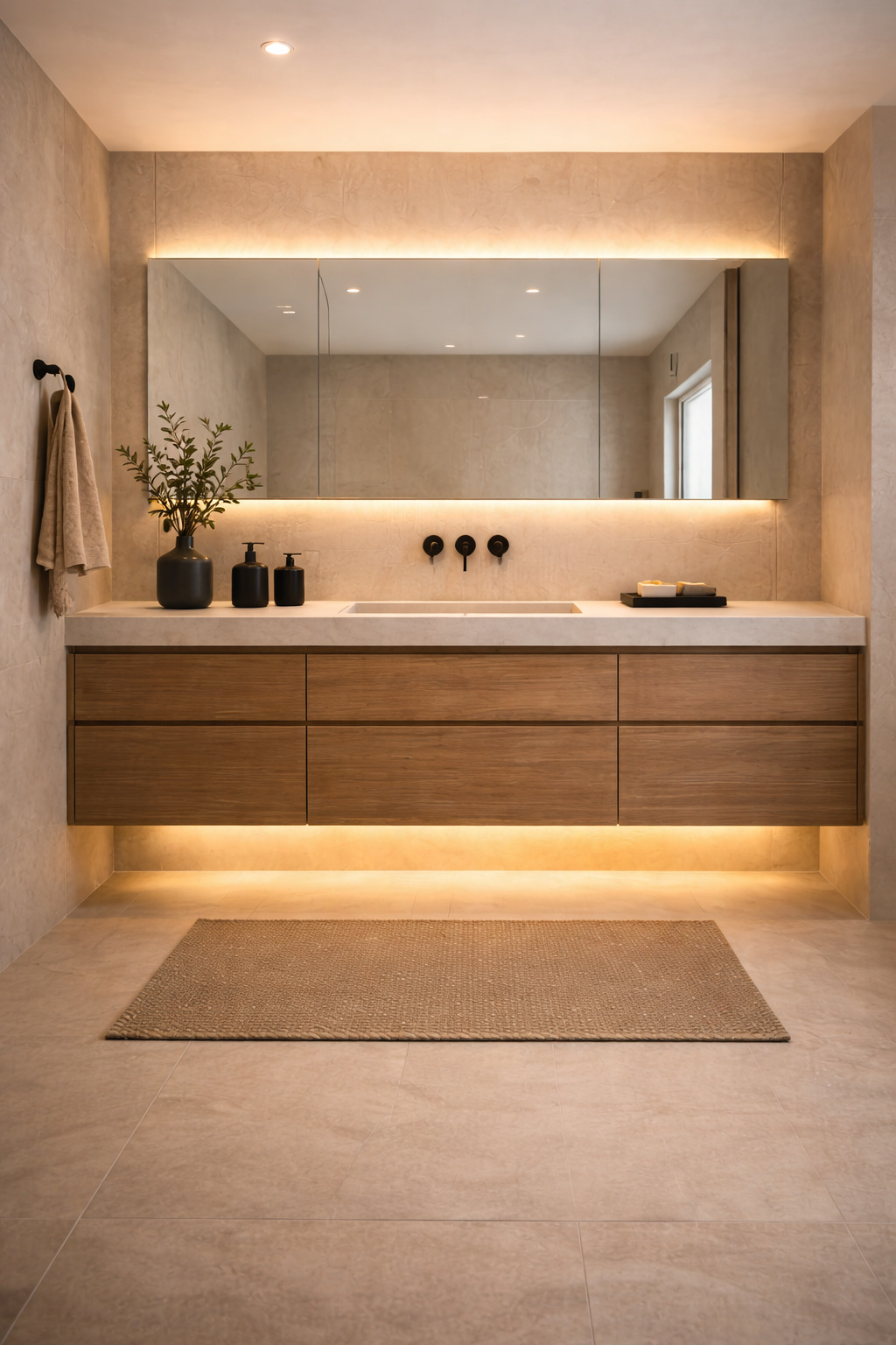 El diseño del baño responde a un estilo minimalista cálido, con influencias mediterráneas y contemporáneas. Se ha buscado una imagen limpia y elegante, evitando elementos innecesarios y dando protagonismo a los materiales, la iluminación y las texturas.