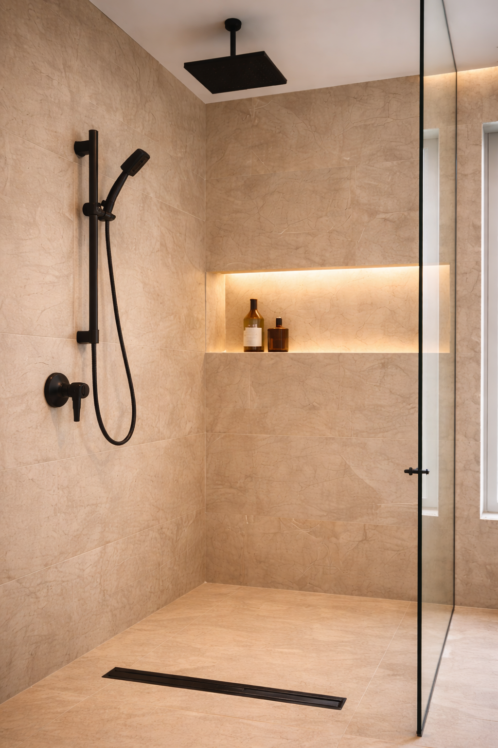 Se ha instalado una ducha de obra a ras de suelo, con mampara fija de cristal, grifería negra mate y nicho iluminado integrado.
